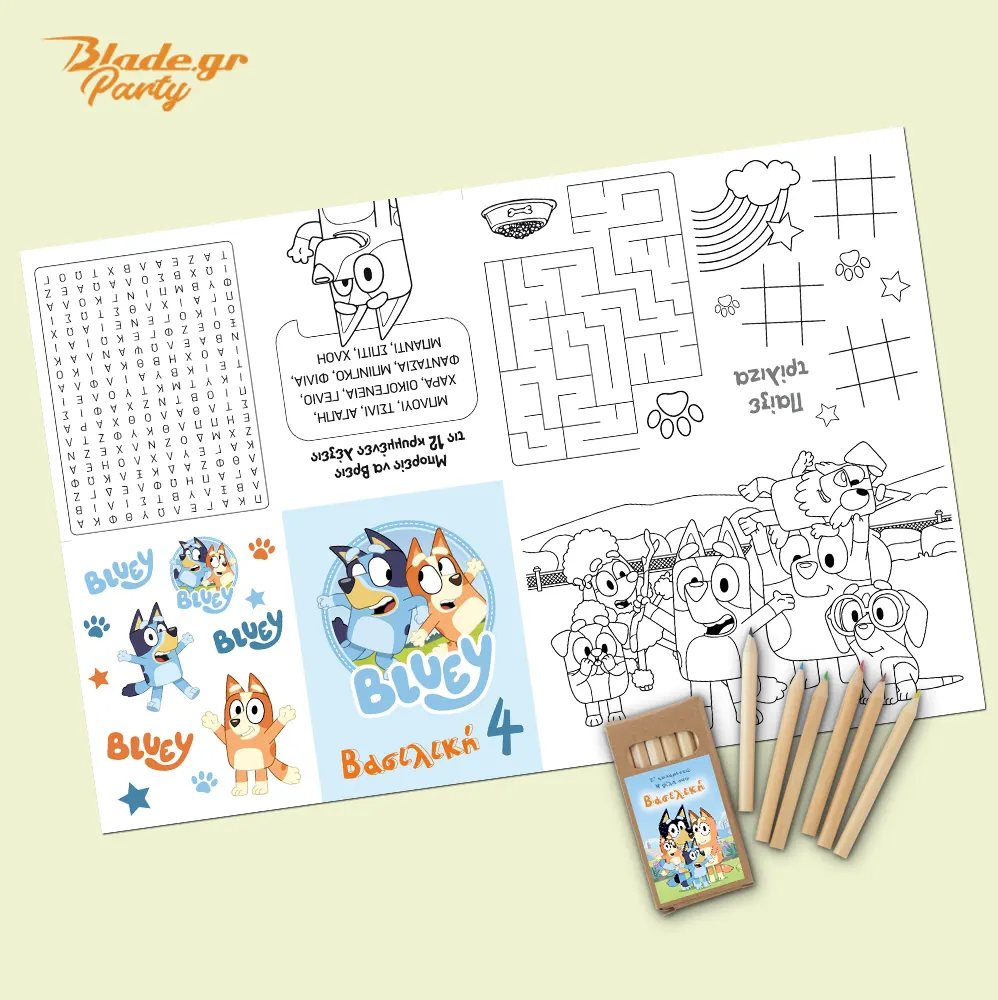 Κάντε το πάρτυ Bluey μοναδικό! Προσωποποιημένο μονοσέλιδο σετ δραστηριοτήτων με ζωγραφιές, παιχνίδια, λαβύρινθο και σετ με ξυλομπογιές.