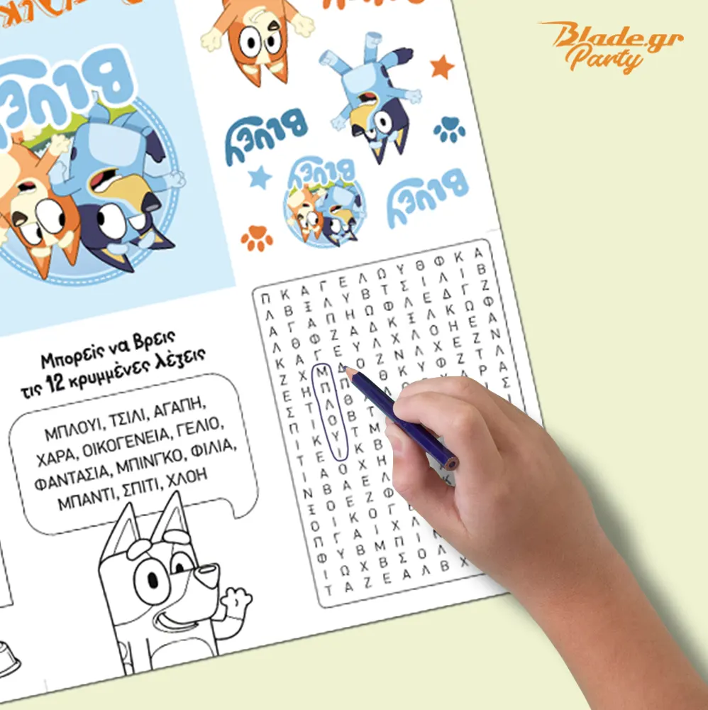 - 1 σελίδα δραστηριοτήτων Bluey 47 Χ 30 εκ. (Α3+) με ζωγραφιές, λαβύρινθο, τρίλιζα, κρυπτόλεξο.