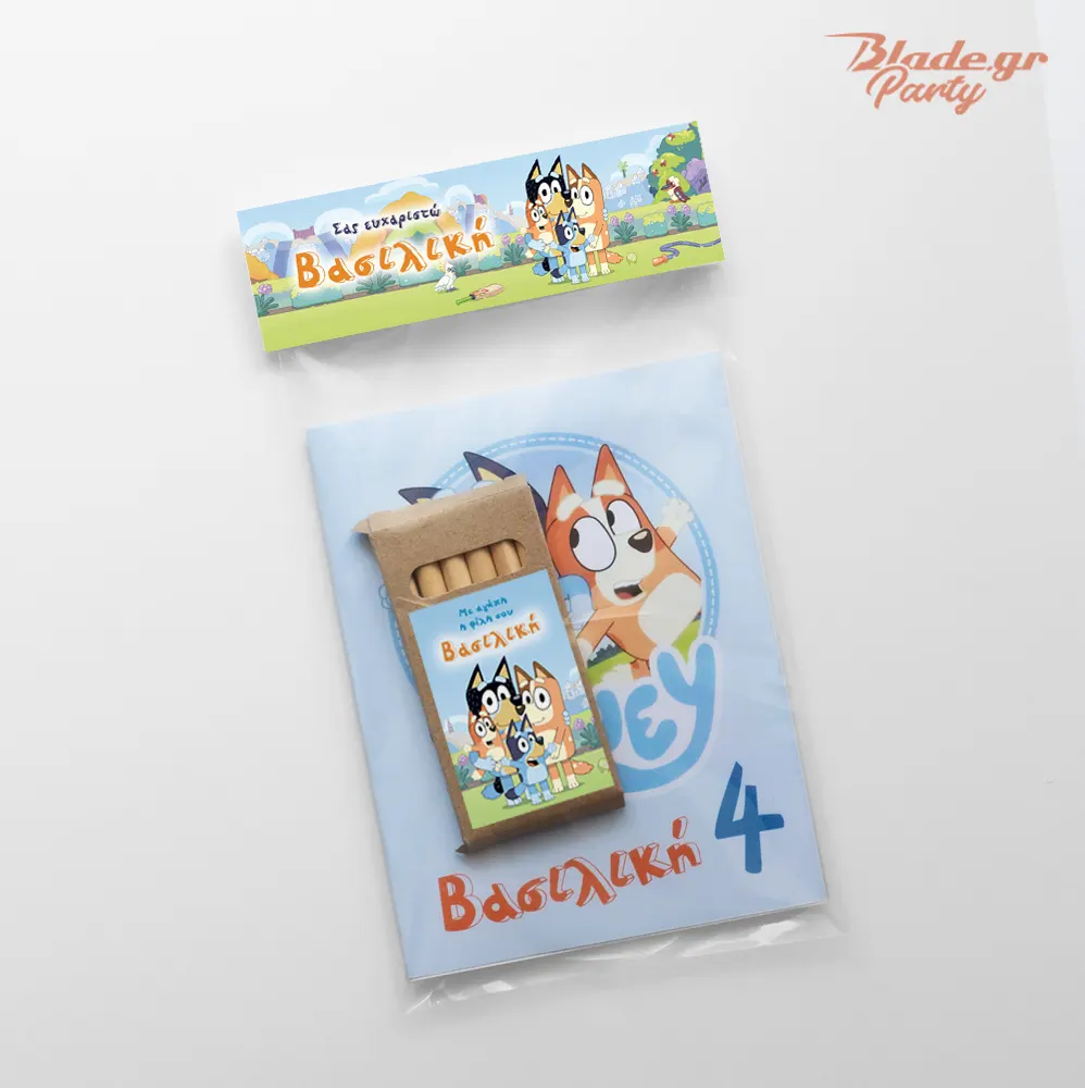 - 🖍️ 1 μικρή συσκευασία ξυλομπογιών με προσωποποιημένη ετικέτα Bluey