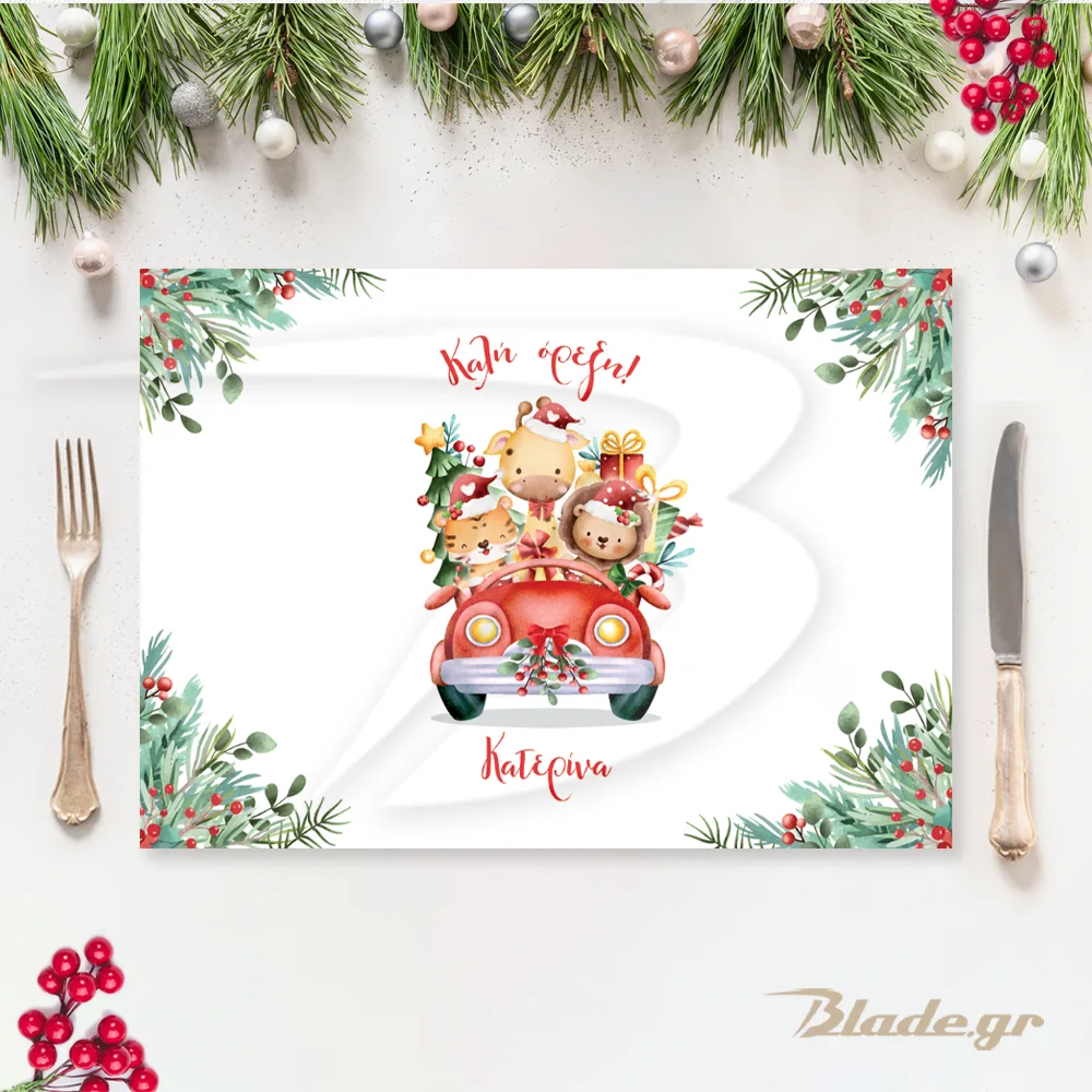Τα πιο χαριτωμένα ζωάκια ζούγκλας (λιονταράκι, καμηλοπάρδαλη κ’ τίγρης) είναι έτοιμα για το ταξίδι των Χριστουγέννων μέσα στο κόκκινο βίντατζ αυτοκίνητο! Το σουπλά φέρει το όνομα του παιδιού σας και την ευχή “Καλή Όρεξη!”, δίνοντας μοναδικό στυλ στο τραπέζι.