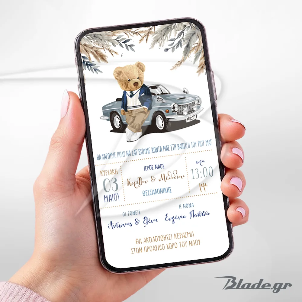 Ηλεκτρονική πρόσκληση βάπτισης Αρκούδος με σπορ αυτοκίνητο
