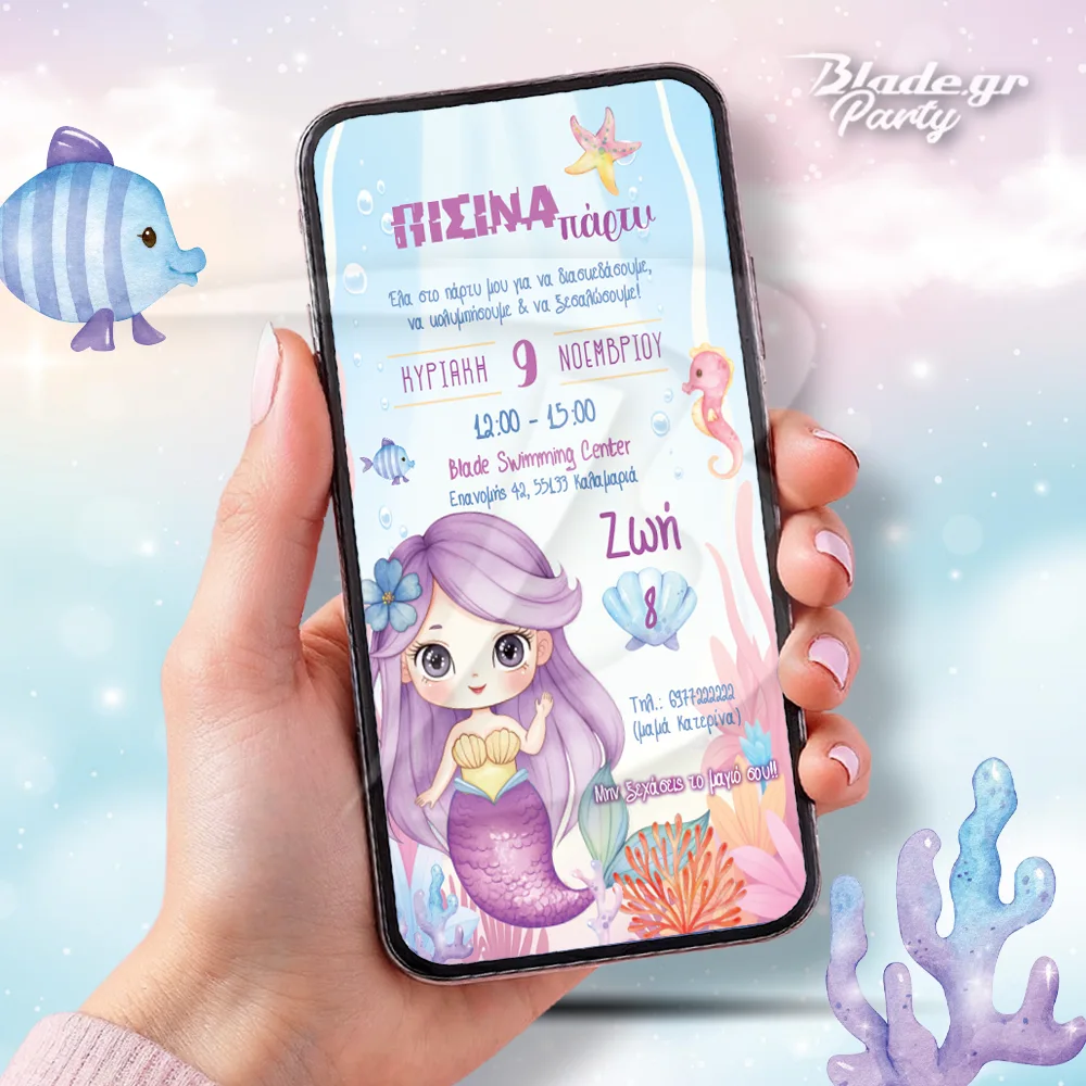 Το προσκλητήριο Λιλά Γοργόνα σχεδιάζεται για εσάς, με τις πληροφορίες του event σας (ημερομηνία, ώρα, τοποθεσία, RSVP κ.ά.).