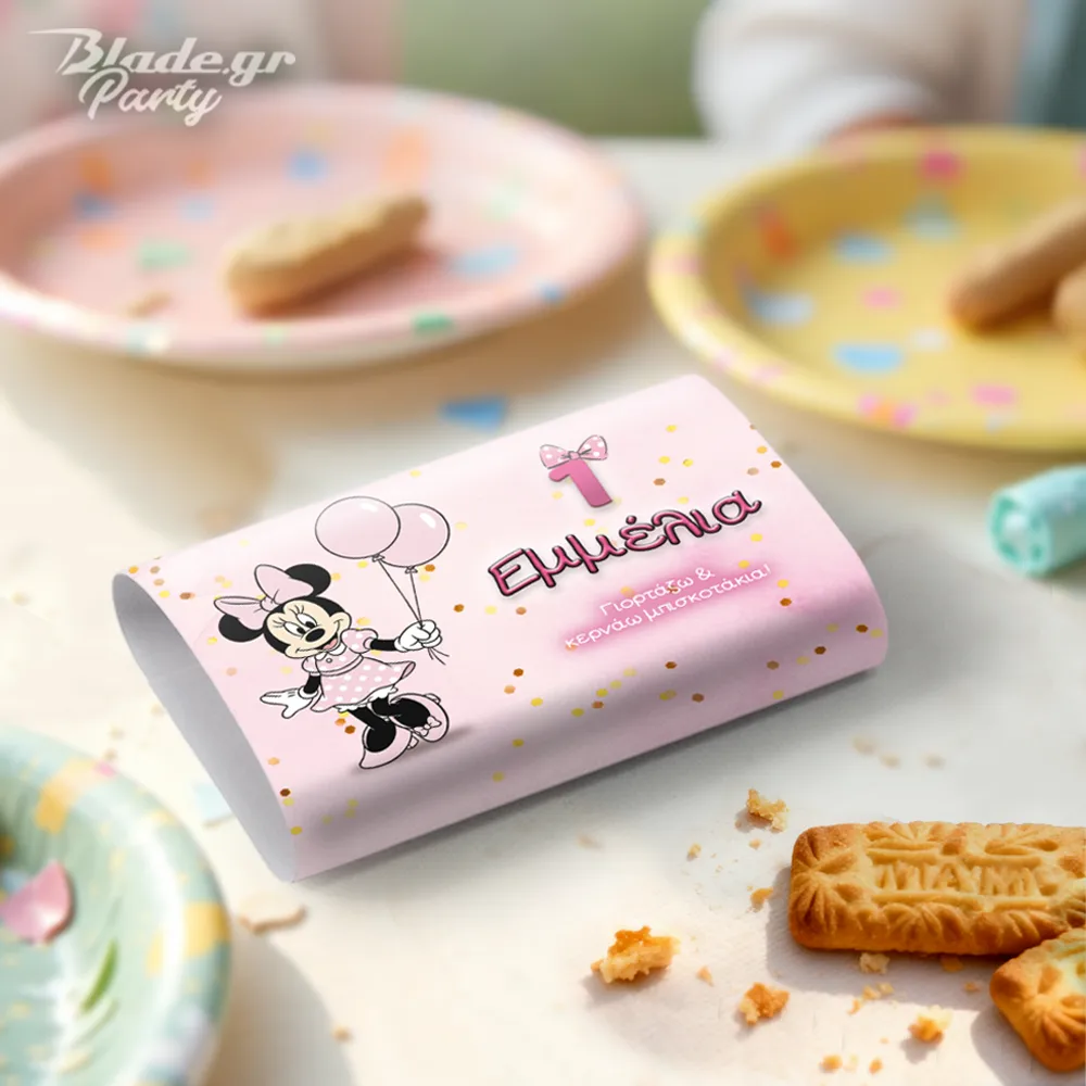 Τα επώνυμα αγαπημένα μπισκότα των παιδιών τυλίγονται σε μοναδικό περιτύλιγμα, σχεδιασμένο θεματικά με τη Μίνι Μάους να κρατάει 2 ροζ μπαλόνια. Όλο το περιτύλιγμα έχει ροζ φόντο με χρυσές πινελιές σαν κομφετί. Δίπλα στη Μίνι μπορούμε να γράψουμε την ηλικία (αν είναι κέρασμα γενεθλίων) και το όνομα του παιδιού που γιορτάζει.