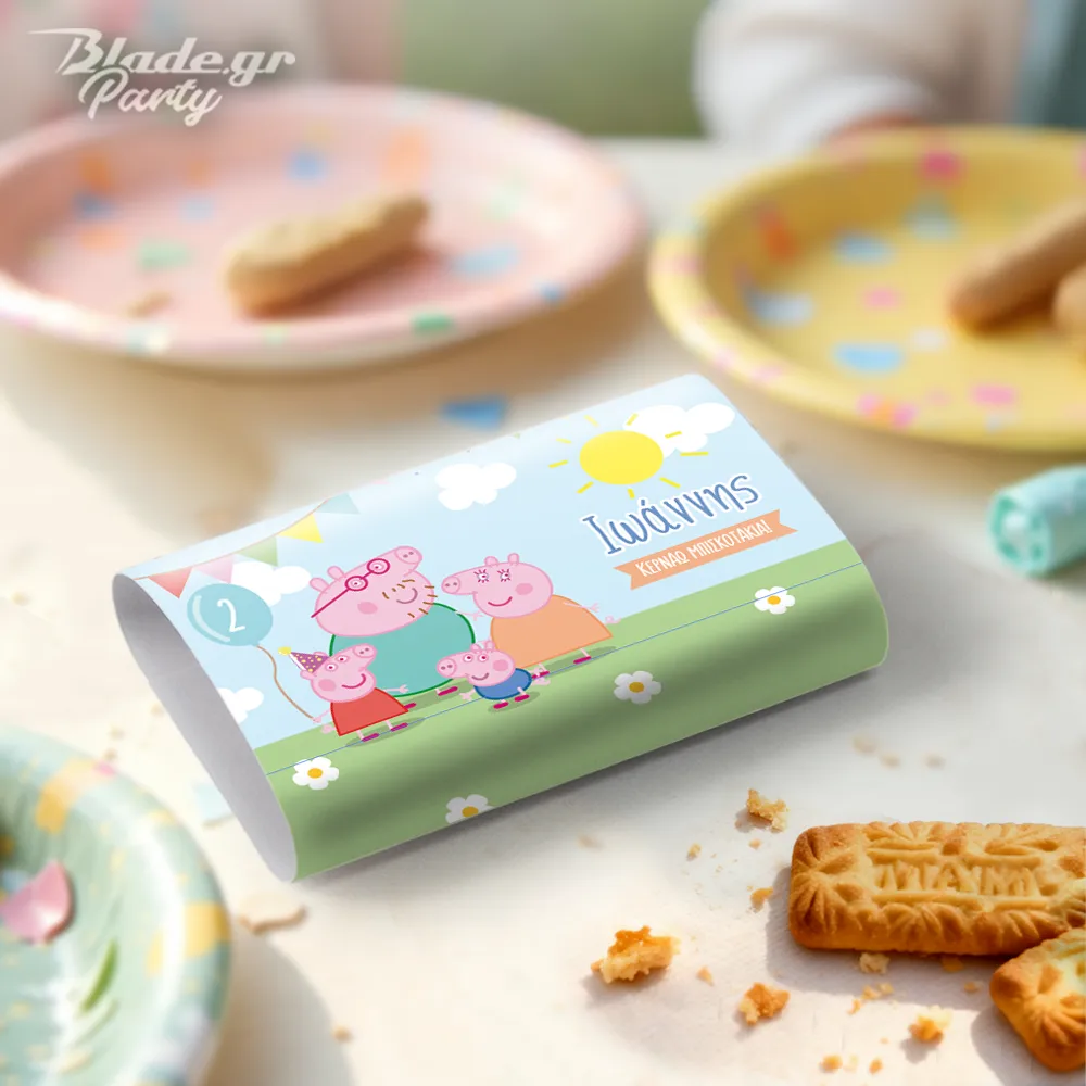 Τα κλασσικά επώνυμα μπισκοτάκια με την χαρακτηριστική γεύση, σε όμορφο, προσωποποιημένο περιτύλιγμα με την αγαπημένη γουρουνίτσα Πέπα και την οικογένειά της, την ηλικία (προαιρετικά) και το όνομα του παιδιού σας. Ένα προσεγμένο κέρασμα που δείχνει φροντίδα και αγάπη και κάνει τη γιορτή του παιδιού σου ξεχωριστή.