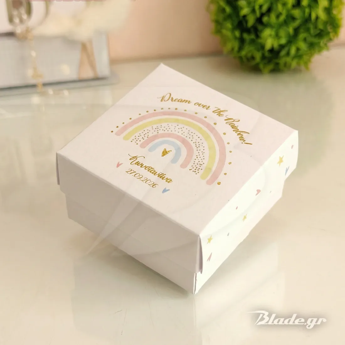 Μπομπονιέρα κουτάκι με καπάκι Ουράνιο Τόξο σε παστέλ αποχρώσεις και χρυσές λεπτομέρειες, προσωποποιημένη, με το όνομα του παιδιού και την ημερομηνία της βάπτισης.