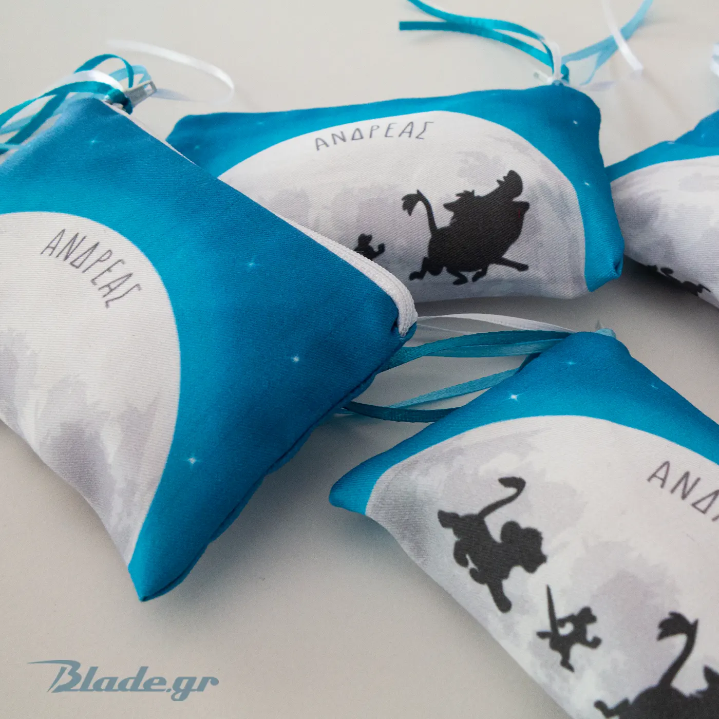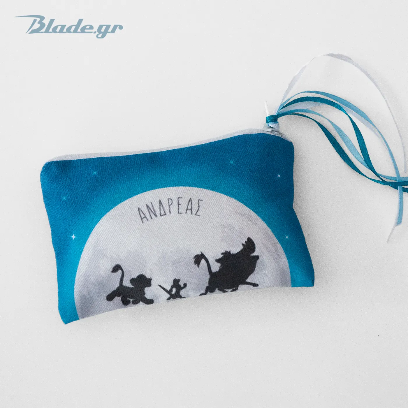 Προσωποποιημένη Μπομπονιέρα Πορτοφολάκι Lion King – Hakuna Matata Κάντε τη βάπτιση του μικρού σας αξέχαστη με ένα υφασμάτινο πορτοφολάκι με θέμα το Lion King. Με προσωποποιημένη εκτύπωση ονόματος και το θρυλικό σχέδιο “Hakuna Matata”, είναι το πιο στυλάτο και πρακτικό αναμνηστικό για τους καλεσμένους σας.