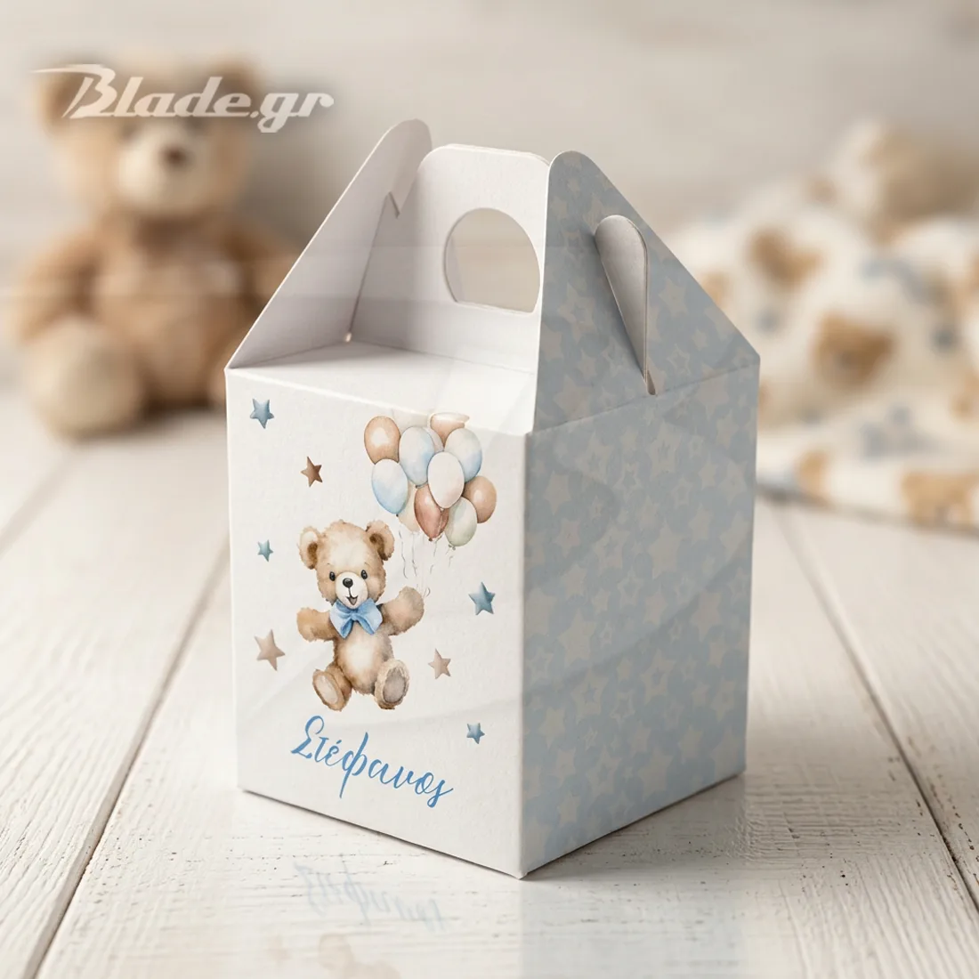 Χρώματα που ηρεμούν: Οι απαλές γαλάζιες και μπεζ αποχρώσεις ταιριάζουν σε κάθε αγορίστικη βάπτιση, ενώ το μοτίβο συνεχίζεται σε όλες τις πλευρές του κουτιού.