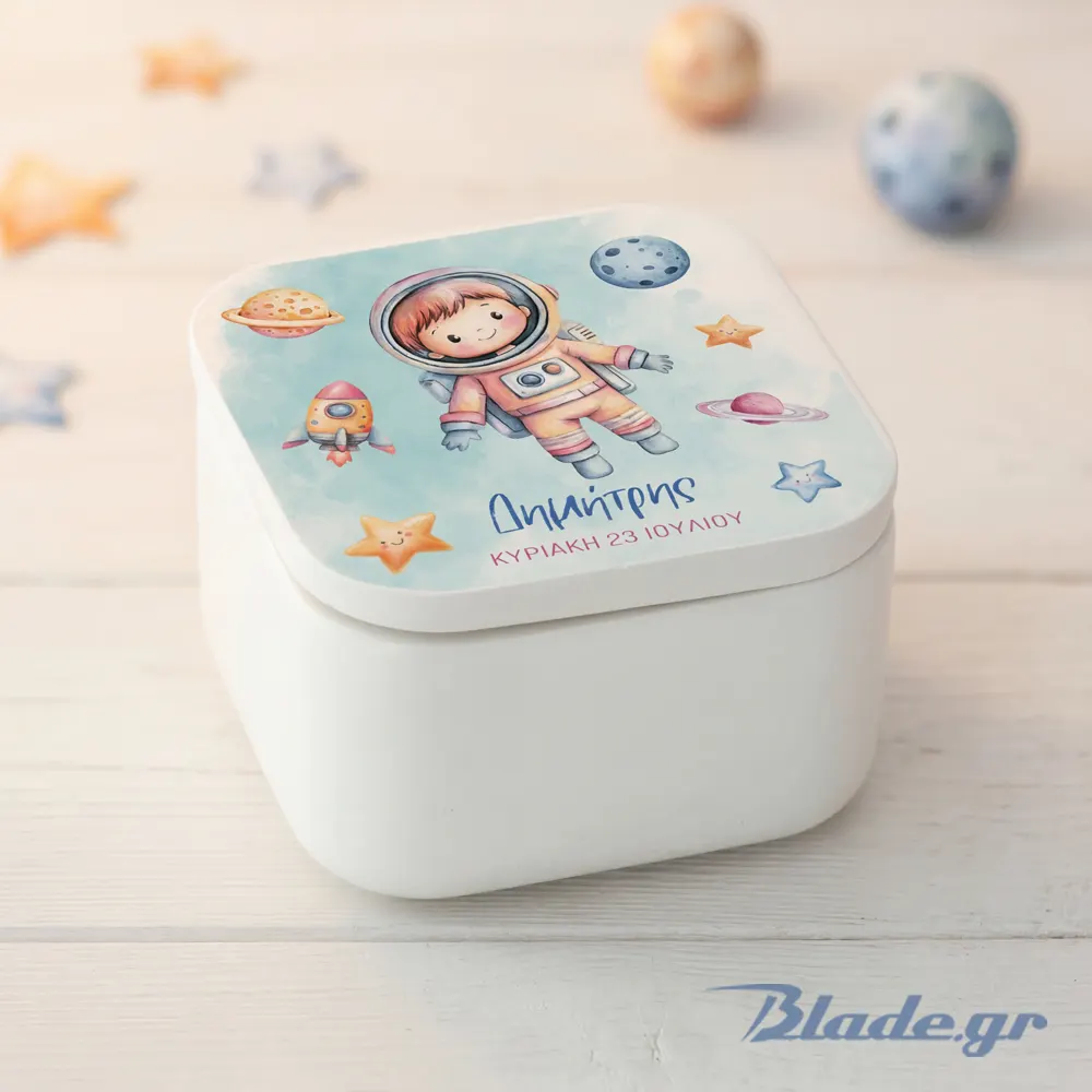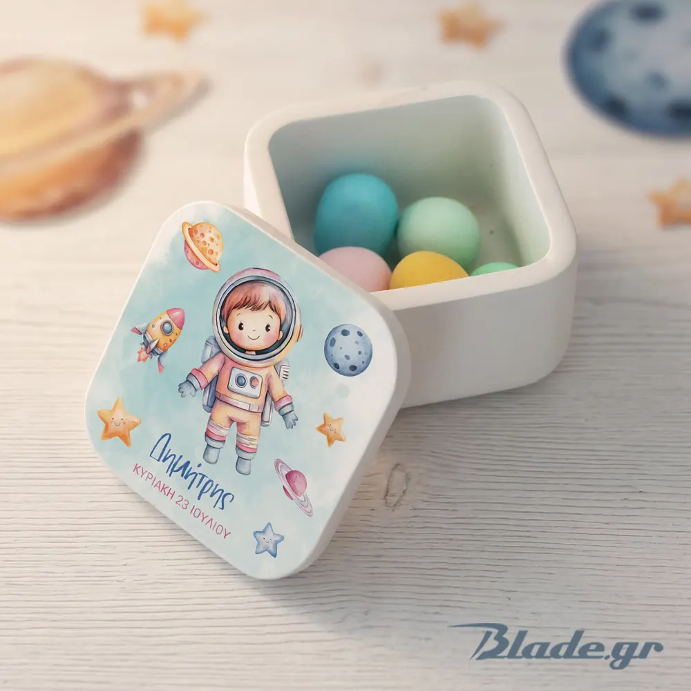 Μπομπονιέρα Βάπτισης “Μικρός Αστροναύτης” – Προσωποποιημένη Τετράγωνη Μπιζουτιέρα με Θέμα το Διάστημα & Πλανήτες