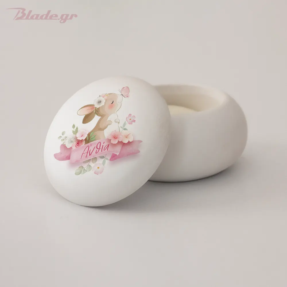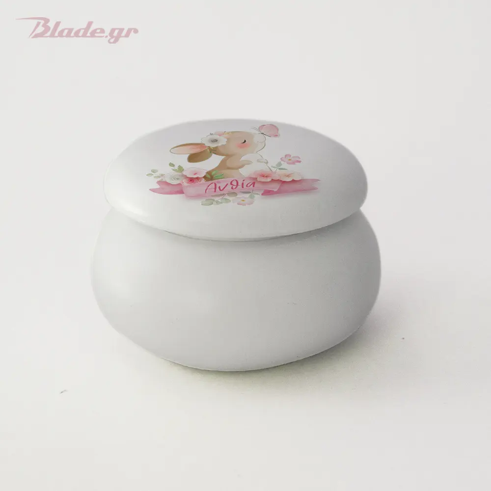 Εντυπωσιάστε με μια premium μπομπονιέρα βάπτισης που συνδυάζει τέχνη και χρηστικότητα. Το λευκό κεραμικό macaron με το προσωποποιημένο όνομα “Ανθία” και το watercolor λαγουδάκι είναι η ιδανική επιλογή για μια chic βάπτιση κοριτσιού.