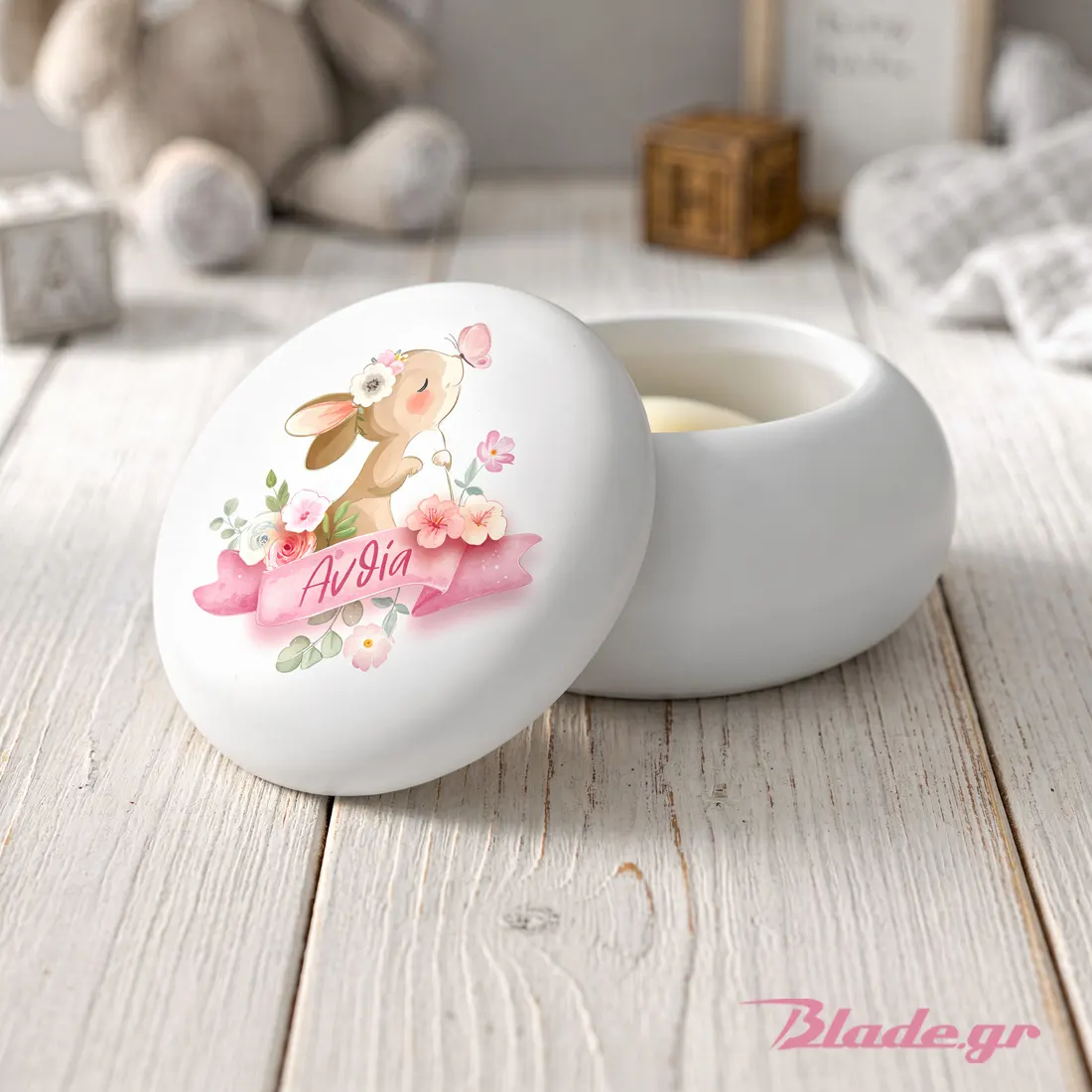 • Προσωποποιημένη Λεπτομέρεια: Στο καπάκι εκτυπώνεται το όνομα της μικρής (π.χ. Ανθία) πάνω σε ένα κομψό ροζ banner, πλαισιωμένο από το χαριτωμένο λαγουδάκι με το στεφάνι και την πεταλούδα.