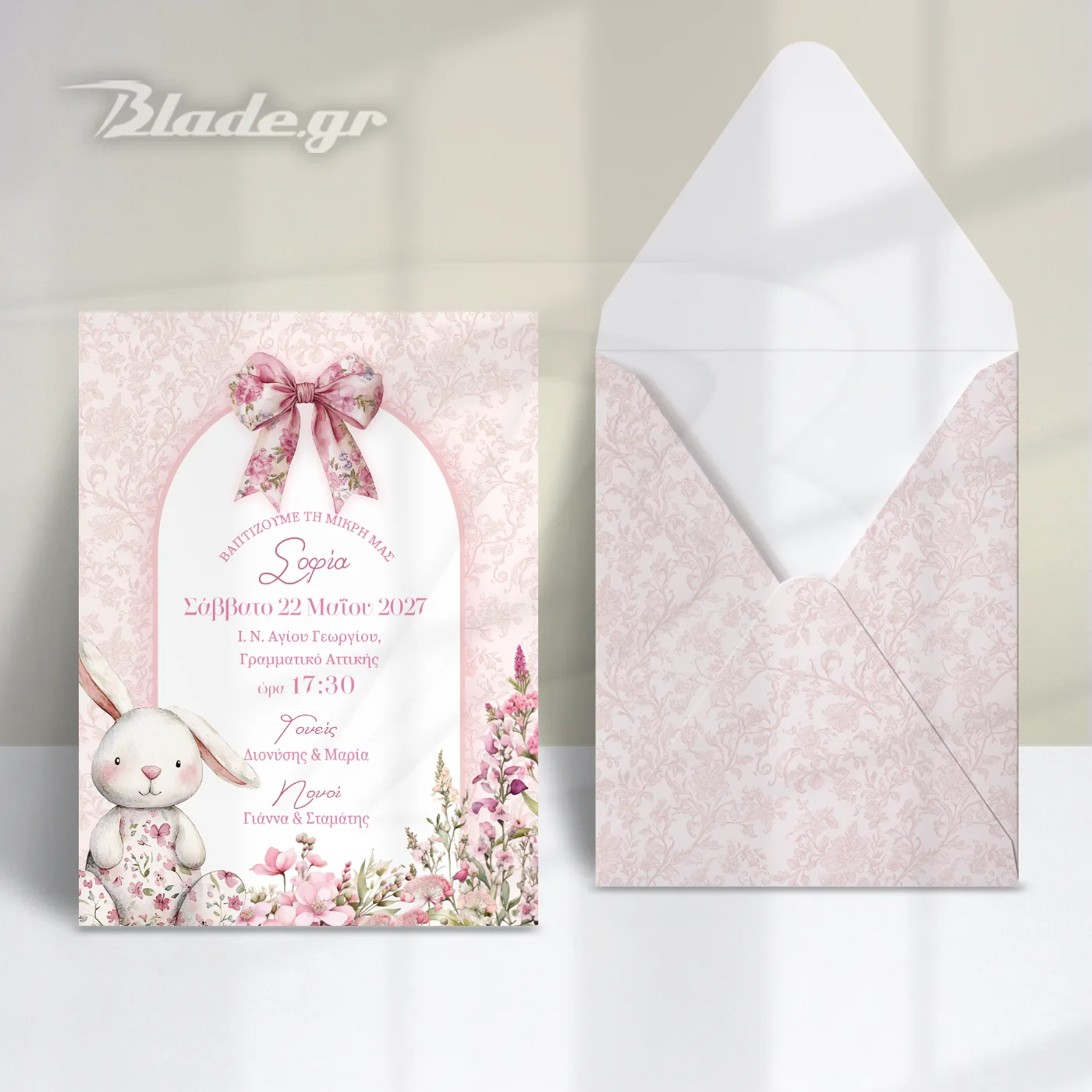 Η Πρόσκληση βάπτισης Λαγουδάκι – Φάκελος με εκτύπωση Pink toile αποτελείται από: