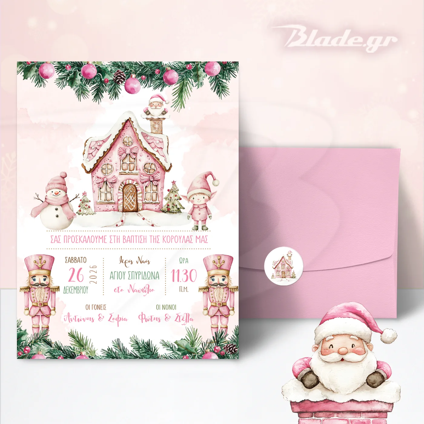 Αυτό το εντυπωσιακό προσκλητήριο με το ροζ τζιντζερόσπιτο, τον Αη Βασίλη, τους καρυοθραύστες κ’ τις γιρλάντες με τις ροζ μπάλες, είναι η ιδανική επιλογή για κερδίσεις την προσοχή των καλεσμένων. Σε ροζ αποχρώσεις, πράσινα στοιχεία και καφέ λεπτομέρειες, δίνει την υπόσχεση ενός ξεχωριστού event.