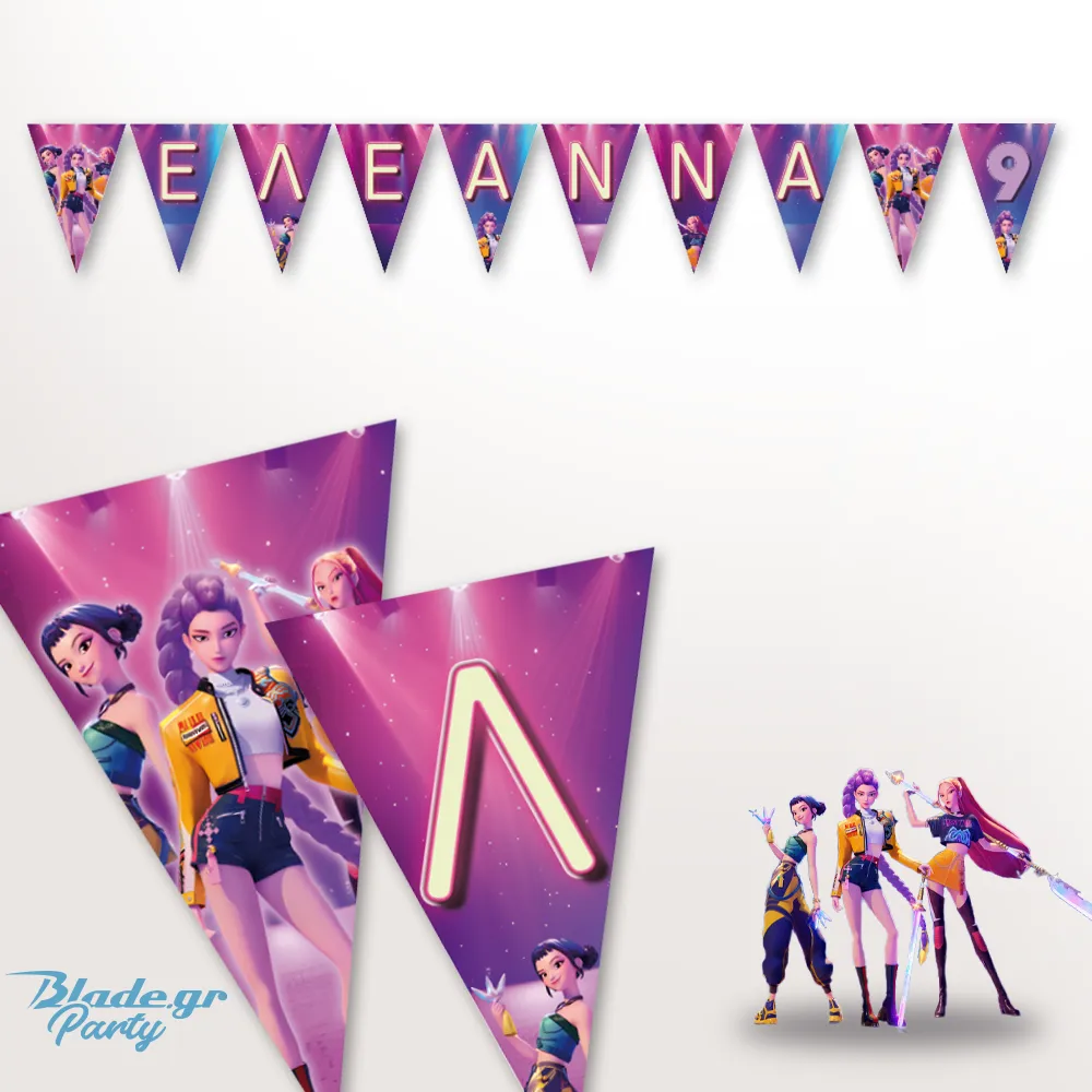 Το θέμα KPop Demon Hunters είναι ιδανικό για κοριτσάκια που λατρεύουν την KPop μουσική και κουλτούρα! Συνδύασε τα σημαιάκια με backdrop, αφίσες, προσκλήσεις, αλλά και δωράκια με τις Huntrix και τους Saja Boys και ζήσε μαγικές στιγμές με το παιδί σου και τους καλεσμένους σας.