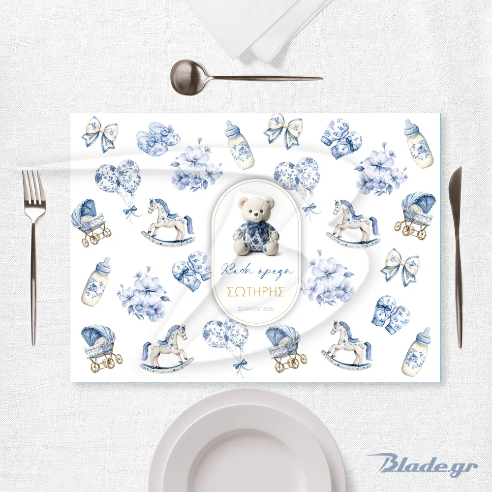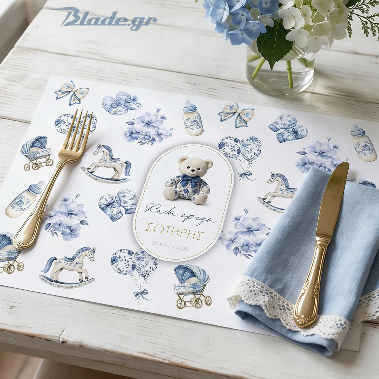 Προσωποποιημένο Σουπλά Βάπτισης Αγοριού Baby Dior Αρκουδάκι Αναβαθμίστε τη διακόσμηση του τραπεζιού σας με ένα Dior style σουπλά. Με το όνομα του παιδιού σας, το εμβληματικό αρκουδάκι και υπέροχα μπλε watercolor στοιχεία, αποτελεί την πιο σικ επιλογή για μια αριστοκρατική βάπτιση που θα συζητηθεί.
