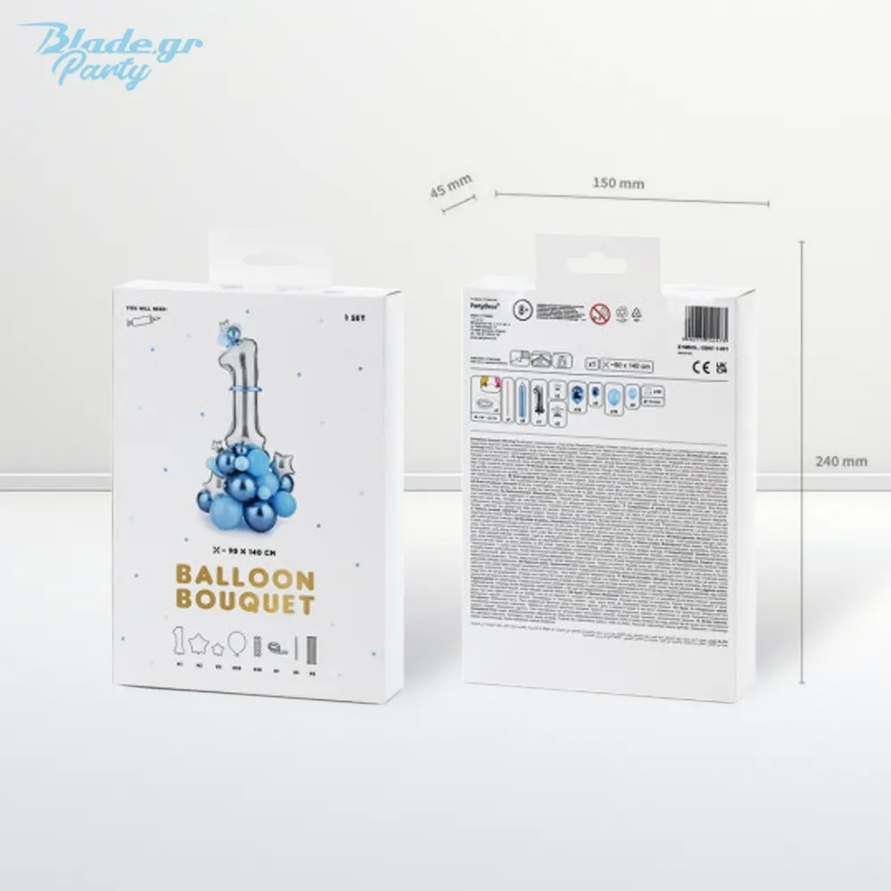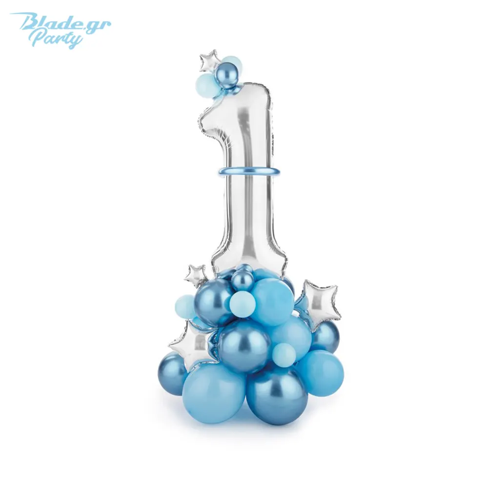 Σύνθεση Μπαλονιών Αριθμός 1 σε Ασημί και Γαλάζιο – Ιδανική για Πρώτα Γενέθλια
