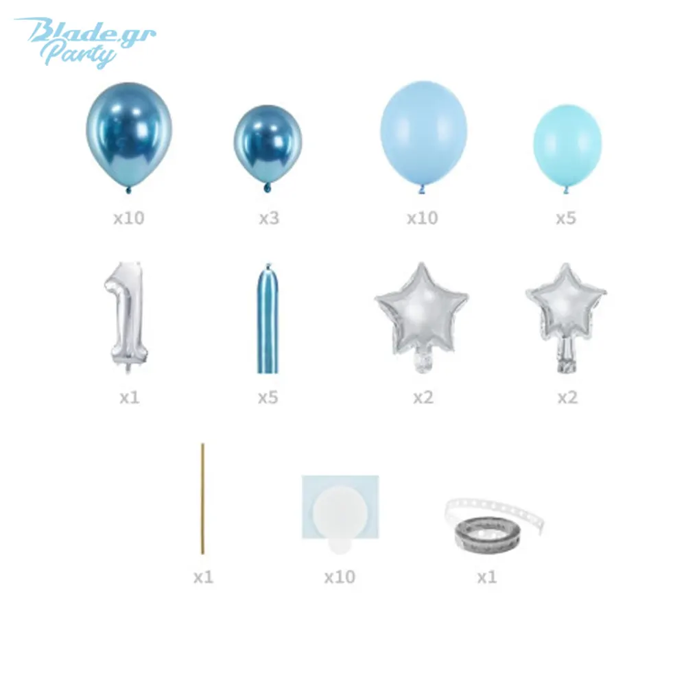 Η κατασκευή συνδυάζει γαλάζια μπαλόνια latex και ασημένια μπαλόνια-αστεράκια, δημιουργώντας ένα εντυπωσιακό κεντρικό στολισμό για κάθε πάρτι.