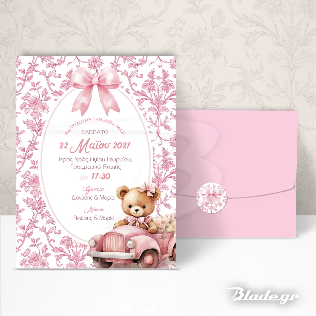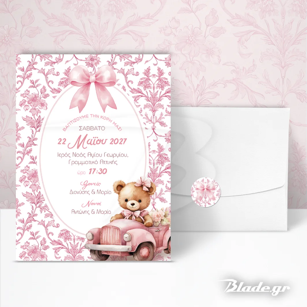 Η Πρόσκληση βάπτισης αρκουδάκι σε ροζ αυτοκινητάκι αποτελείται από:
